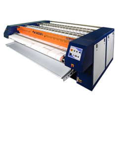 Máquina de passar tecidos planos, com sistemas de aquecimento elétrico, a vapor ou a gás. Para a segurança de quem a manuseia possui uma grade que, em caso de acidente, desliga e reverte a rotação do cilindro..